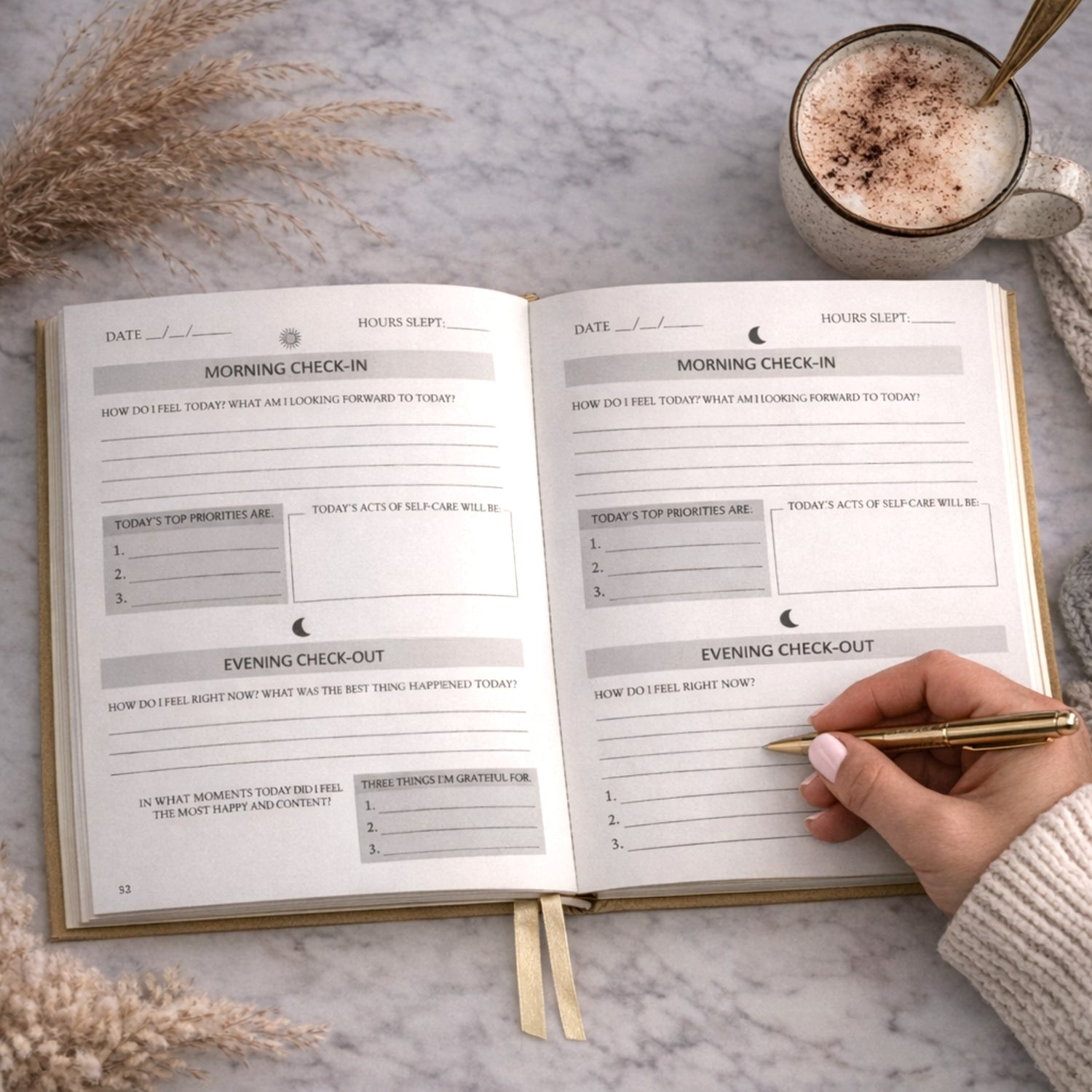 Each day includes a morning check-in, priority setting, a daily self-care intention, an evening reflection, gratitude practice and space to reflect on your day.